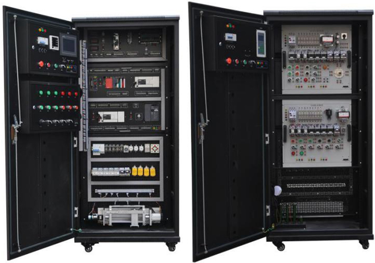 1.本装置是由控制柜、受控对象等组成一个完整系统,具有占地面积小、操作方便、可移动、内部安装有照明设施、操作面板,各控制点和通讯接口均引出到专用的接线板上,使实训更加便捷。