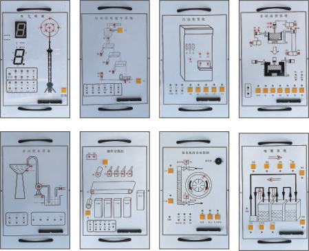 演示装置上对PLC的输入输出均采用24V电源,5V电源供执行机构中的外围使用,每套演示装置主要由十七块实验挂箱组成,它们的型号分别为: