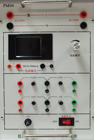 提供低压交流电源(0V、6V、10V、14V抽头各一路及中心抽头17V两路)、三极管(3DG6、3DG12、3CG12)、二极管(1N4007、1N4148)、稳压块(7812、7815、7915、LM317)、电阻、单结晶体管、蜂鸣器、电容等。配有相关实验元器件。