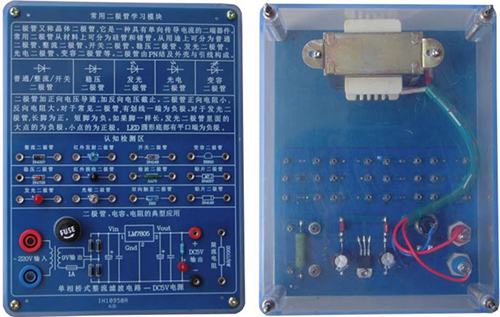 底盒使用190mm×145mm的开模有机透明塑料底盒,模块面板采用印制电路板PCB工艺,可以直观看到器件的实物及相关的原理介绍。对于典型应用及易损器件安装在面板背面,透过透明底盒能够看到器件实物,方便感性认识、检测测试,同时也能防止器件的损伤。