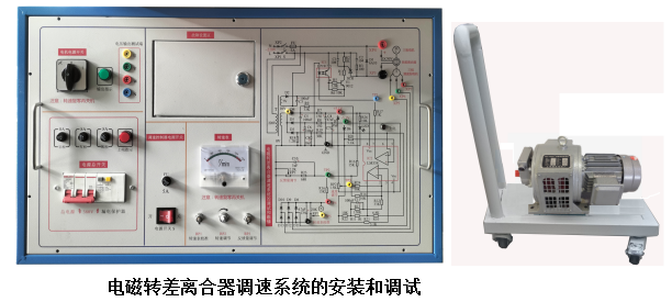 电磁转差离合器调速设备包含电机,转差离合器、三相测速发电机和控制器单元,提供工业用电磁调速电机1台,带有小推车,万向轮,小推车具有刹车功能。调速控制箱面板上绘有调速控制系统电路控制原理图,设有电压及波形测试点,强弱电测试点经不同接线端子区别,带有故障设置单元,不少于8个故障点。