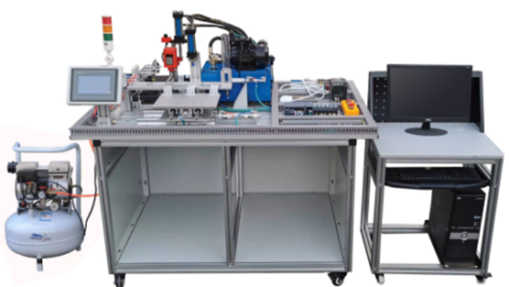 机电液气一体化综合实训考核装置的实训工作台为铝合金型材组合而成,台面上安装有上料、传送、冲压加工、夹紧、钻孔加工、分拣、入料槽等,并配有液压系统、气压系统、变频器及继电器控制、PLC等