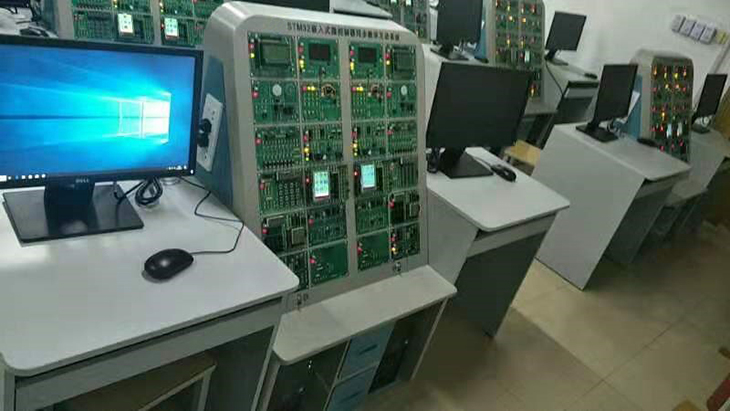 6)平台下端两侧摆放电脑主机,主机中间另有两个抽屉存放实验器材。双工位同步教学实验装置。平台上部摆放2个工位的专业课程教学模块至少有12块,分体式结构、模块化设计,可根据教学任务的不同进行模块更换;