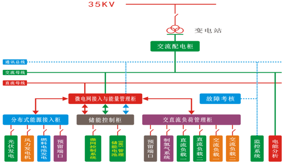 储能与稳定控制系统由双向储能变流器、切换开关、储能蓄电池组、电池管理系统(BMS)、直流功率计量仪表、低压线路保护器、电流互感器、分流器、测试端子、通讯网关等组成。主要实现对微电网储能的充放电管理、直流母线与交流母线的双向变流、内置隔离微电网与市电电网的PCC节点开关。