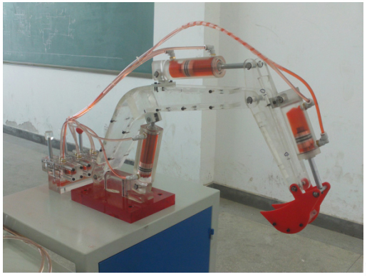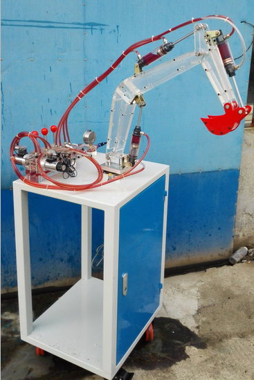 实训台主要由底柜,透明大臂,透明斗杆,透明挖斗(红色),透明油缸,透明集成阀岛,透明手动换向阀,透明电磁阀,旋缸马达,减速器等成