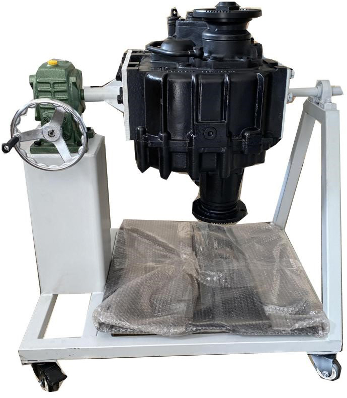 采用减速翻转机构,可使分动箱旋转任意角度,并能任意位置锁止,便于学生从不同的角度进行拆卸和装配。