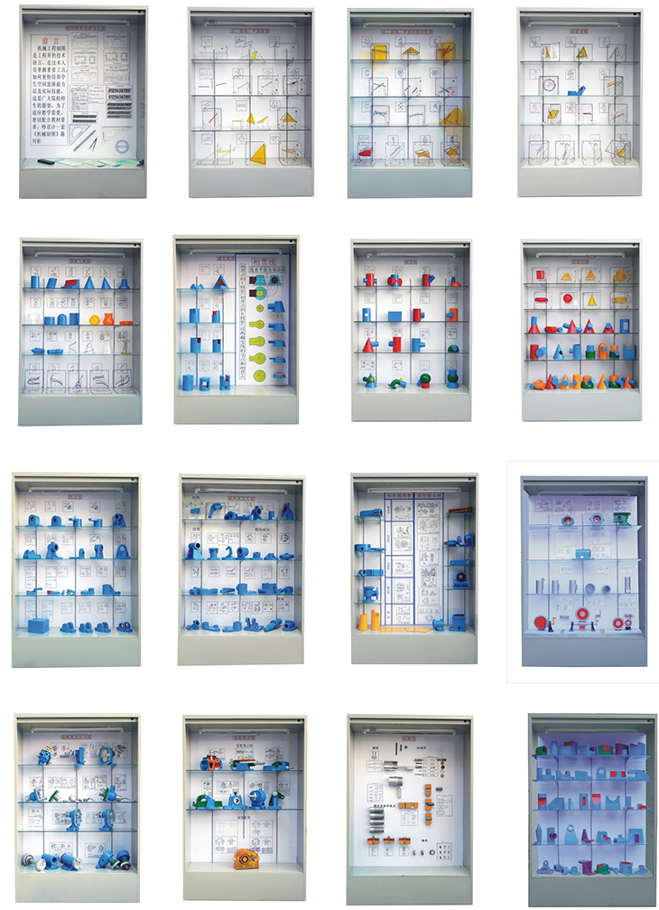《机械制图》示教陈列柜是适用于全日制普通中专、职工中学、电视中专、职业高中机械类专业的制图教学,亦可供其它相近专业使用或参考。为突出培养学生画图能力和看图能力这条主线,对机械专业学生理论学习,使用范围增强认识,加深理解,本陈列柜是一套提高教学质量的理想设备。
