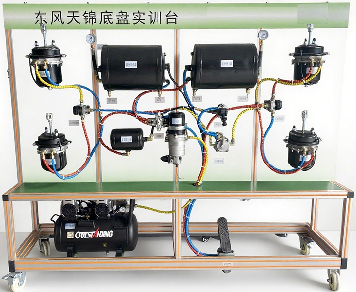 1.东风天锦EQ1120GA气路系统实训台示教板台架上具有的 全新东风天锦EQ1120GA2 原车零部件有空气压缩机总成、空气干燥剂、前桥储气筒、后桥储气筒、手制动储气筒、再生储气筒、辅助储气筒、四回路保护阀、制动脚阀、驻车阀、继动阀、制动管路、气压表若干个。