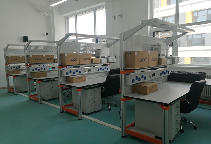 电子工艺实习室是供学生焊接练习、电子产品组装调试操作的实验室,学生进行焊接操作。配备的仪器设备主要有直流稳压电源、示波器、万用表、工具箱等。为了改善实习室的空气环境卫生,还专门配备了抽风系统。开设的课程有《电子工艺实习》、《电工实习》,包括电路元件的选配、电子产品的安装、焊接和性能测试等环节。电子工艺实验实训室设备主要面向汽车、机械、电信、电气、计算机、经济、管理等学院的学生,培养学生的动手实践能力、分析问题和解决问题的能力以及创新精神。