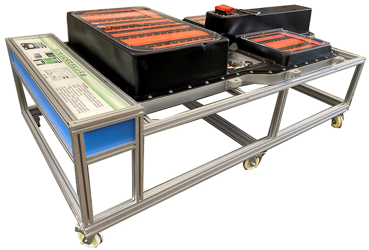 动力电池包及BMS总成、紧急断电开关、维修开关、霍尔电流传感器,直流接触器(包含充电继电器、总正继电器、总负继电器、预充继电器),单体电池充电器,一体化全铝合金型材搭建的移动台架(2540×1400×1300mm