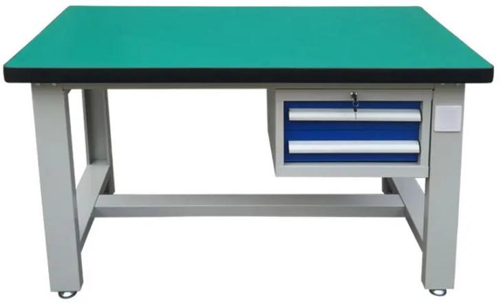 功能:由桌身、工具柜、台面组成,用于电气及机械结构的装配平台。 尺寸:不小于L1500mm×W700mm×H780mm 桌身:装配桌预设电源插座扩展孔,依据用途可加装电源插座。整个装配桌可随意拆装,方便运输安装。 工具柜:采用冷轧钢板折弯焊接而成,工具柜有多个抽屉,可储藏工具,放置于装配桌底部一侧。 台面:采用50mm厚高压复合成型纤维板,表面覆盖2mm绿色防静电胶皮,四边并以5mm ,PVC截面封边,台面具有耐磨、耐热、耐污及易清洁等特点。具有耐冲击、耐酸碱、吸震、防静电的功能