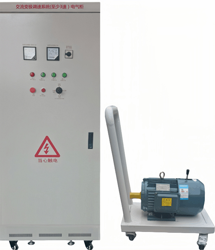 三相异步电动机型号为 YDEJ100L- 6/4/2,极数为6/4/2,额定功率为0.75KW/1.3KW/1.8KW,额定电压380V),额定转速950/1440/2900rpm),电流为2.6A/3.7A/4.5A,接法Y/Y/Y,电动机安装在钢板小车上,配有四个万向轮,带专用电机连接电缆,带电磁刹车系统1套。