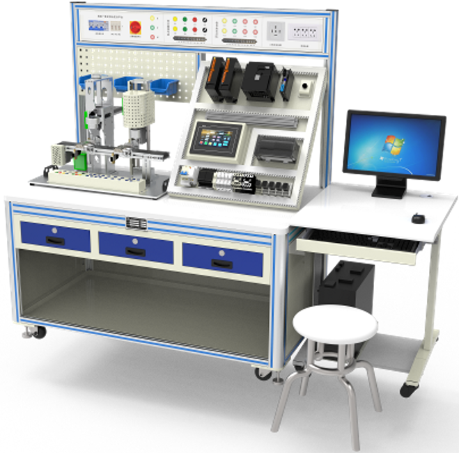 机电一体化实训工作站包含实训平台、控制挂板、应用模块、电脑桌、圆凳三部分组成,实训平台采用优质铝型材做骨架,铝型材立柱与实训桌面连接。左右两侧及后面封装优质钢板,正面设计储物柜与抽屉。