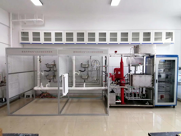 建筑给排水电气及自动化实训系统整体采用铝型材框架和网孔板进行设计,主要给排水管道设备安装在钢架底座上、具备开放式的特点,由生活给水系统、消防给水系统、热水给水系统、排水系统、污水处理系统和控制系统六个部分组成。