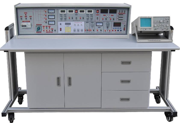 电工、模电、数电、电气控制综合实验台具有较完善的安全保护措施,较齐全的功能。实验操作桌中央配有通用电路插扳,电路板由进口ABS注塑而成,背面装有压铸而成九孔成一组的铜片,表面布有九孔成一组相互联通的插孔,创新实验元件模块在其上任意拼插成实验电路。实验元件制成透明创新模块,直观性好,盒盖印有永不褪色元件符号,线条清晰美观。盒体与盒盖采用较科学的压卡式结构,维修、更换元件拆装方便。元器件放置在实验操作桌下边左右柜内,实验时取存方便,大大提高了管理水平,规划化程度,大大减轻了教师实验准备工作。