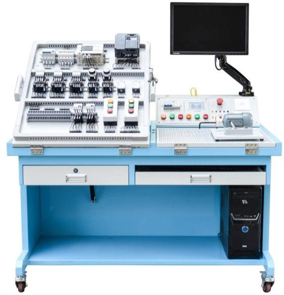 ▲设备由实训屏(内置电源)、实训桌(含键盘)、储物柜三大部分组成。钢制表面经高温喷塑处理,美观大方且有效起到防锈绝缘的作用;电源箱的布局依次为电源保护装置、电源指示装置、电源输出;实训桌左侧安装有角度可以调节的嵌入式的考核平台1张,所有元器件均采用端子引出,学生接线只需在端子上进行接线,可以有效的保护元器件,转接端子采用接插两用端子排,方便与元器件和实训电源屏的连接,右侧装有网孔板一块,角度可调嵌入式安装;实验桌底部装有至少4个导向轮,方便设备移动;储物柜采用标准结构和抽屉式,用于存放工具以及实训资料。电脑通过可调节电脑支架安装于电源屏的上方。