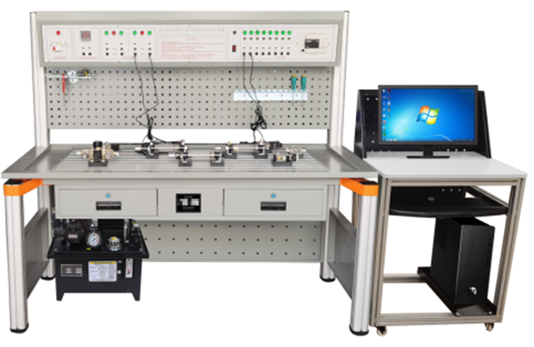 液压综合实验台由实验桌、实验操作区、网孔工具挂板、液压泵站、常用液压元件、主控机箱、电脑桌等几部分组成。