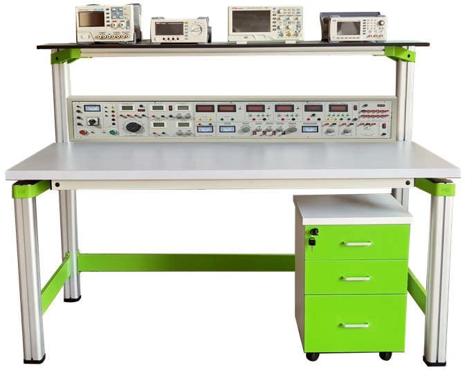 外形尺寸为1600(长)*700(宽)*1200(高),实验桌主体结构全部采用高性能表面氧化的铝型材及一次成型铝压铸框架连接构件,连接构件采用压铸成型工艺(非焊接工艺),经机加工、抛丸、喷砂,表面静电喷涂工艺,安装方便、快捷,用户可自行DIY组装。桌体立柱采用工业铝型材成型工艺,表面氧化处理,截面尺寸:70×70mm,四面带槽,槽宽约8mm,端部配套塑料堵头。桌面采用不少于40mmE1级实木板材,耐油耐水浸泡不起泡、不开裂、不褪色,桌面板下设支撑框架,承受力不少于200kg。配备储存柜,储存柜底部4只高强度万向可制动PU脚轮,方便移动。实训装置整体简约不简单,高端大气,符合现代化产品审美和发展趋势。