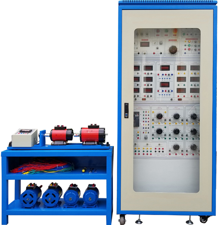 "电机综合实训台、电机及拖动控制实训柜"是由本公司设计的新颖综合实验装置,综合了目前我国高等院校"电机学"、"电机与拖动"、"电机控制"、"交直流调速"等课程实验大纲的要求。特别适用于高等院校现有的电机拖动及控制,交直流调速实训设备的更新改造,同时也为中等专业学校、职业技术学院等新建或扩建实验室,迅速开设实验课提供了理想的实验设备,为教师或研究生开发新实验或进行科学研究工作提供良好的实验条件。