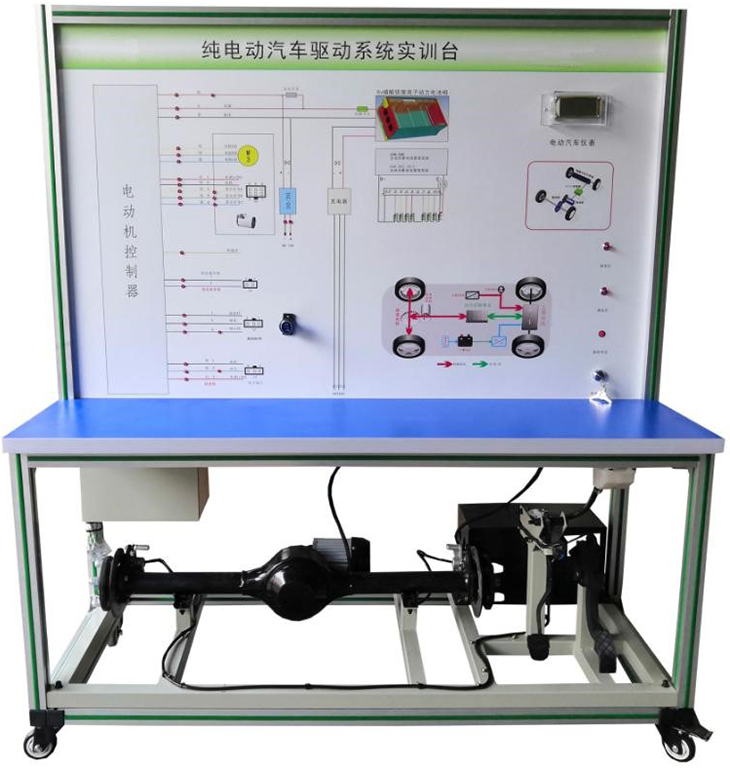 检测控制面板(装有各种检测端子,1448×940mm彩色电路图和工作原理示意图)、组合仪表、点火开关、电机控制器、车载充电器与充电接口、DC-DC转换器、锂动力电池组、电动车电机(直流无刷电机)与变速箱、后轮左右液压制动装置、驱动桥传动装置、刹车开关、档位开关、油门控制装置、大电流继电器、电源总开关、急停开关、辅助蓄电池(12V45AH)、一体化全铝合金型材搭建的移动台架(1500×700×1700mm (带自锁脚轮装置,带安装检测端子的原理面板,面板1448×940mm)、故障考核系统、设备操作说明书。
