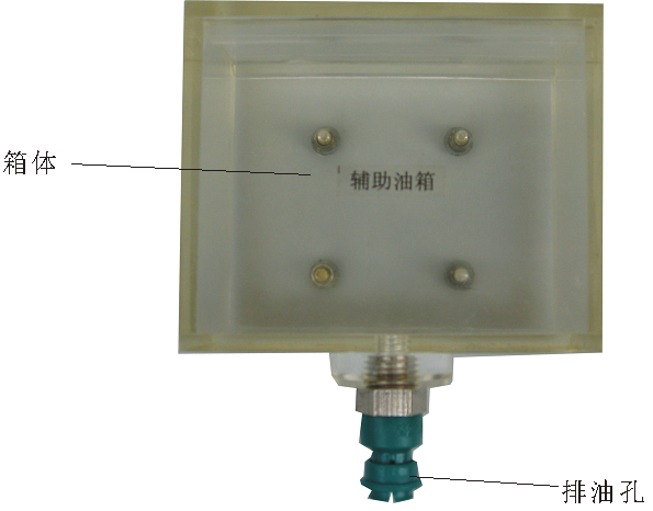 2、辅助油箱采用了封闭箱体结构,外壳材料采用进口透明有机玻璃,在辅助油箱的上端配有螺旋盖油孔,螺旋盖上设有排气孔。下端有透明有机材料制造的排油阀。