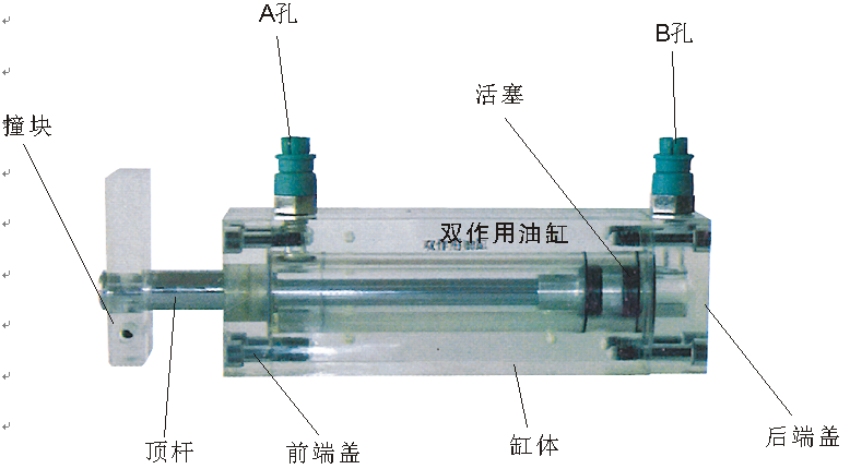 2、双作用油缸的缸体,端盖,行程撞块,撞块支承等均采用了进口透明有机玻璃材料。顶杆采用了45#中碳钢,并配合油接头,密封圈,内六角螺丝等标准件精制而成。能通过它明确地观察活塞、顶杆、油封、油孔等结构及其运行过程。