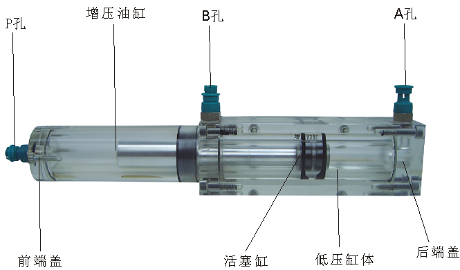 2、增压油缸的前端、后端盖、低压缸体、增压缸体等均采用了进口透明有机玻璃材料精制而成,透明清晰,活塞杆采用了合金铝材料,并配合油接头,密封圈,内六角螺丝等标准件装配而成,通过它可明确地观察到活塞杆,油封,油孔等结构及其运行过程,具有形象逼真,性能可靠等优点,它既可作为教学模型,也可以液压实验元件进行实验演示。
