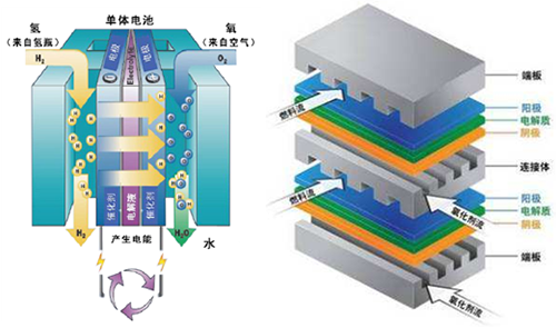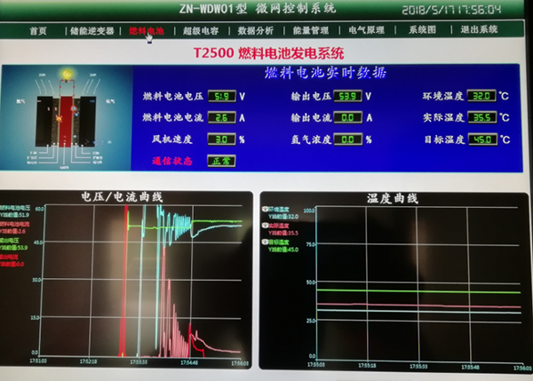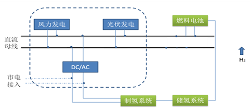 其工作原理是风力、光伏发电系统发电,并由电池储能,由储能逆变系统转换成交流电后接入电网,燃料电池单元所发的电能经DC-DC转换后送入直流总线作后备储能;系统可离网运行亦可并网运行,在网端能耗负荷内完成削峰填谷功能。