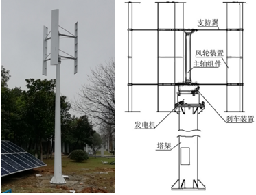 风力发电系统由一台2KW垂直轴风力发电机组、叶片、风机控制器塔架等组成。